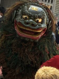 獅子舞です。本土と違って二人で前足、後ろ足を担当し、動物的な動きが沖縄の獅子舞です。