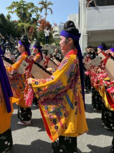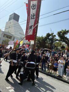こんどは男達の祭り、旗頭行列。沖縄には神輿がない代わりに男達の出番はやはり旗頭。